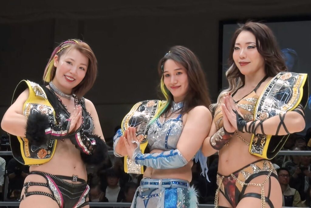 Yuuka’s been calling me “old lady” lately… (laughs), but I think it’s because all three of us are, in a sense, intelligent adult women. Whether it’s during matches, on the mic, or in other situations, when one of us steps forward, another naturally steps back. I feel like each of us instinctively understands and fulfills the role needed at any given moment. That’s partly because we communicate so well on a daily basis, but I also think our serious nature, life experience, and mutual respect play a big role. I also feel like our wavelengths and values just click.