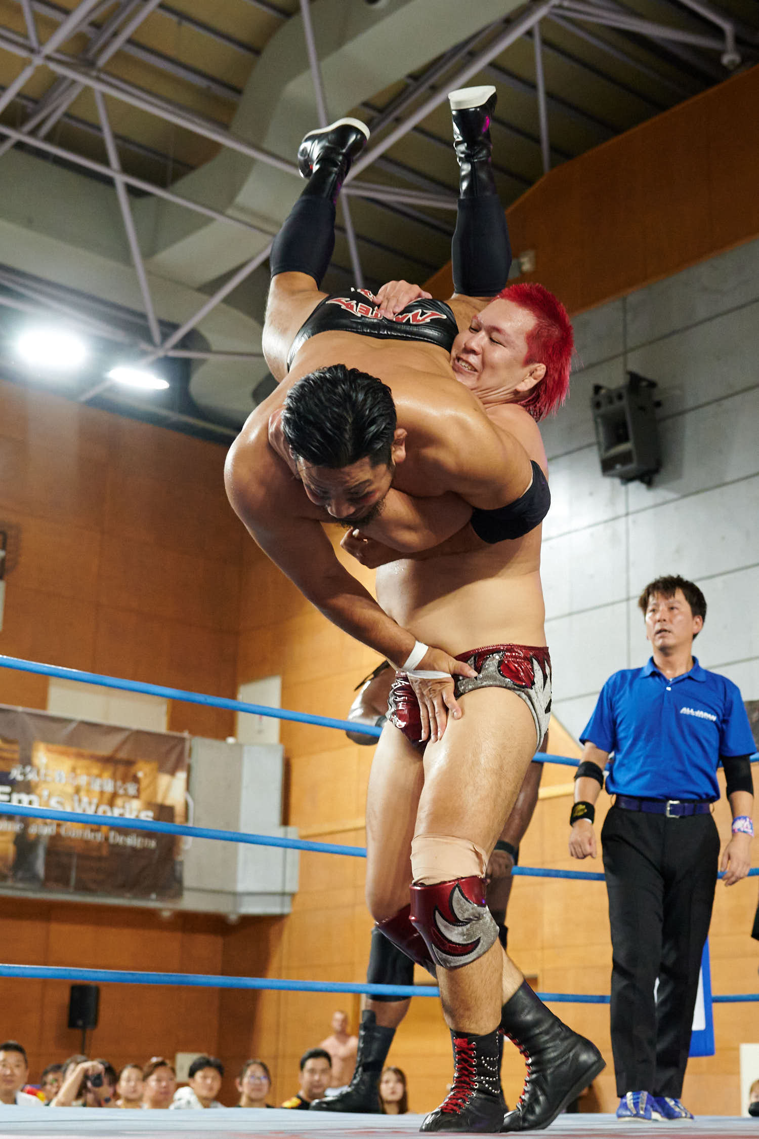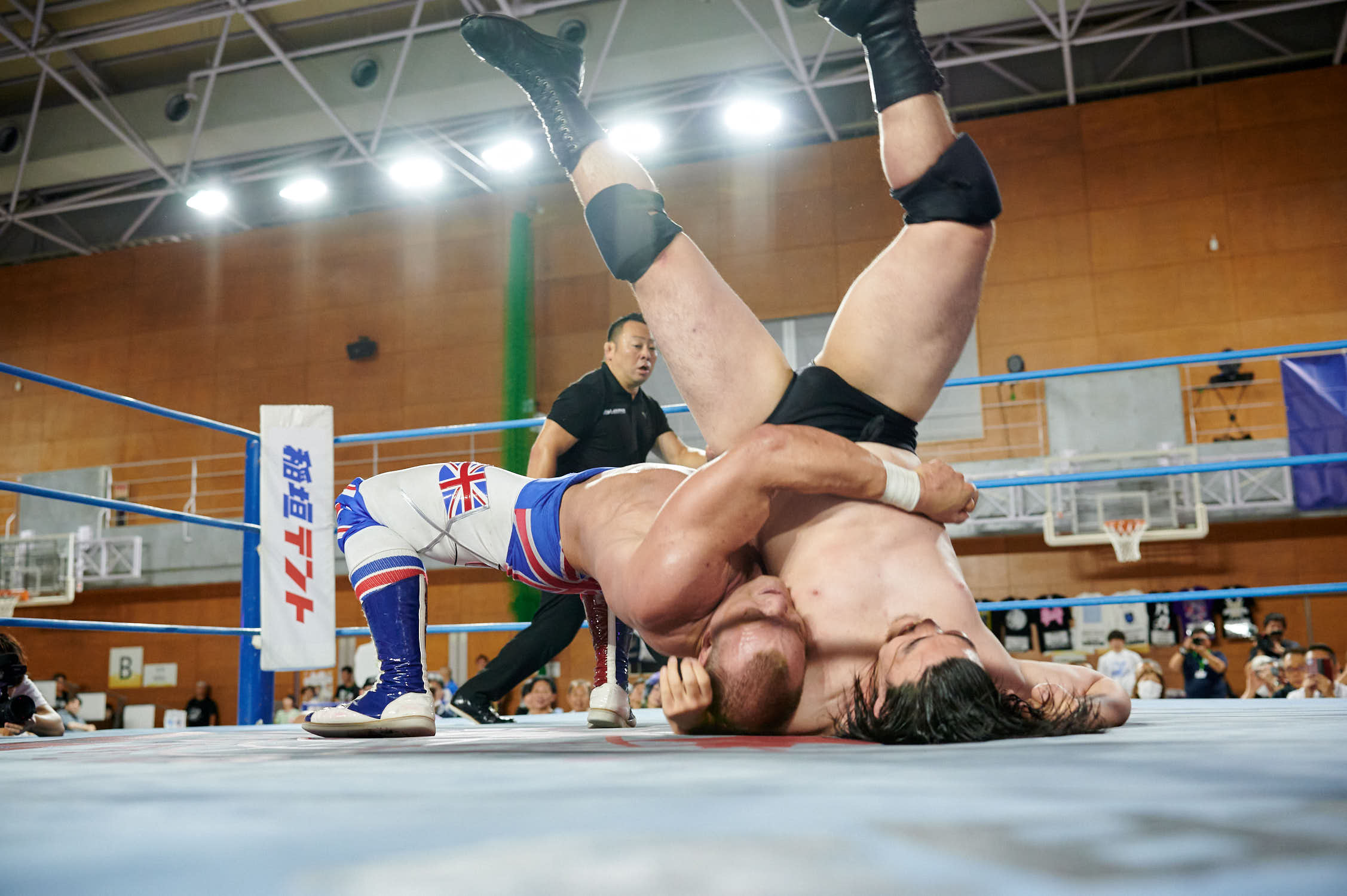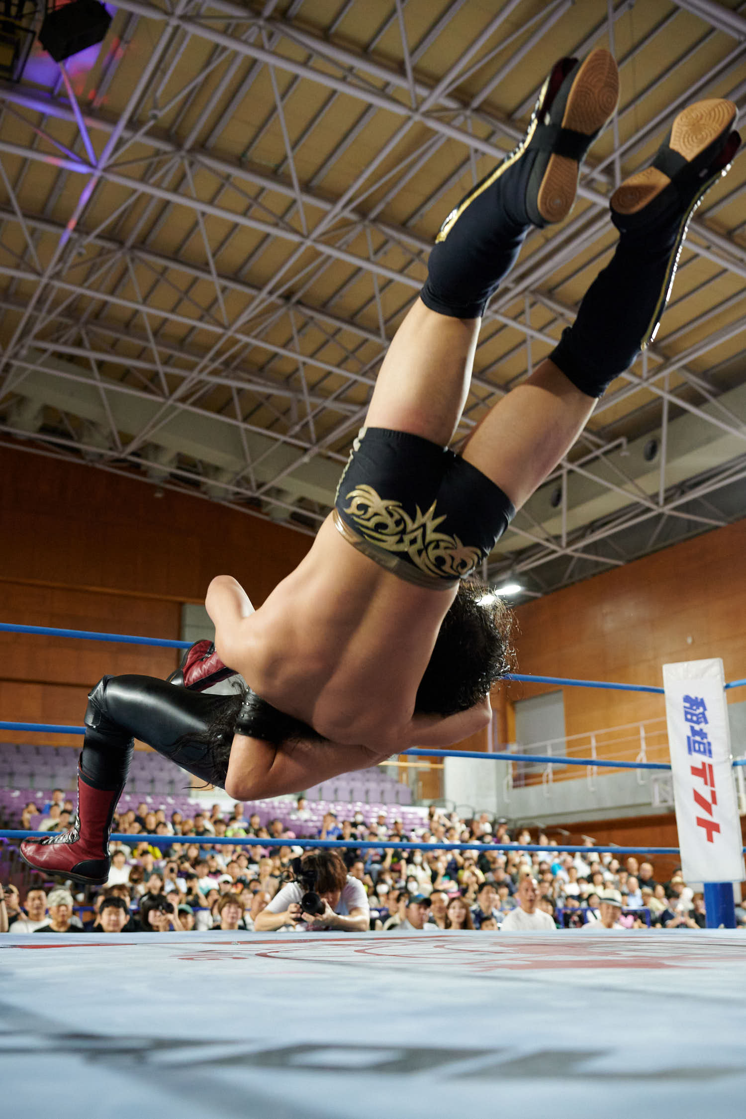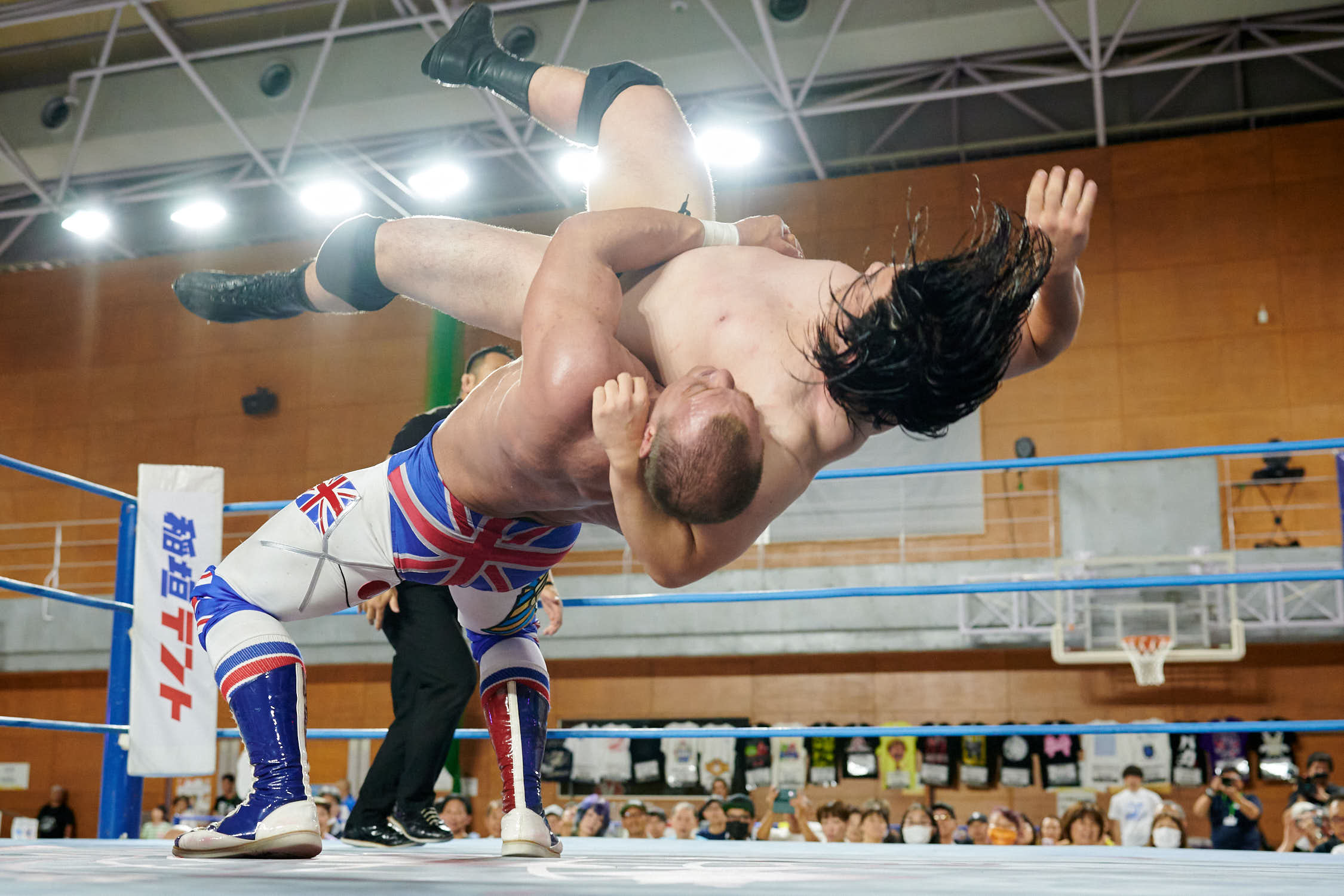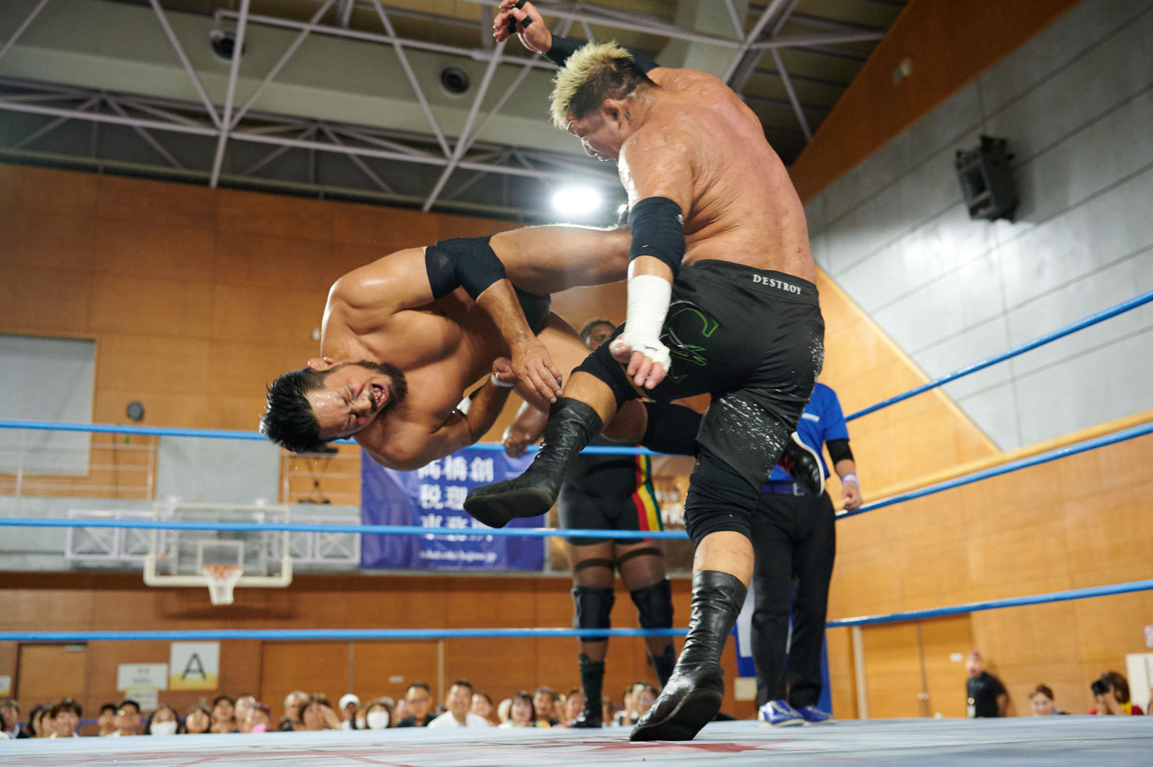 Tokyo— While Giant Baba’s life-size cutout stood sentinel at Machida Gym yesterday, the real tribute to All-Japan Pro Wrestling’s founder was written in the devotion of 855 fans who filled Sun Machida Asahi Gymnasium to support both charity and the unique heavyweight wrestling style that continues to define AJPW’s global identity.
