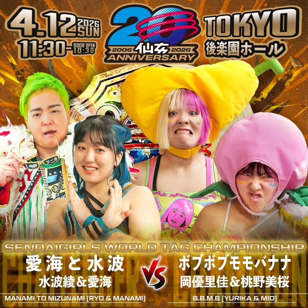 The Sendai Girls Tag Team Championship will be defended as the current champions Yurika Oka & Mio Momono A.K.A. Bob Bob Momo Banana will face the challenge of Ryo Mizunami & Manami. This will be the second defense of the titles by Oka & Momono as they have held the belts since Dec. 26th 2025.