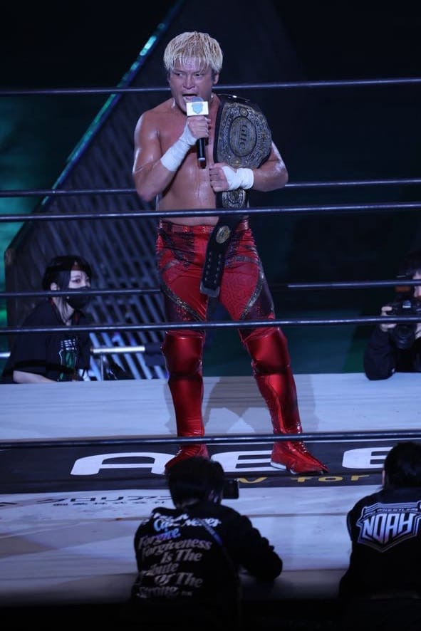 Spoiling Kenoh’s party and wearing a TEAM NOAH shirt (following the formation of his new faction), Go Shiozaki arrived to challenge Kenoh for the big belt.