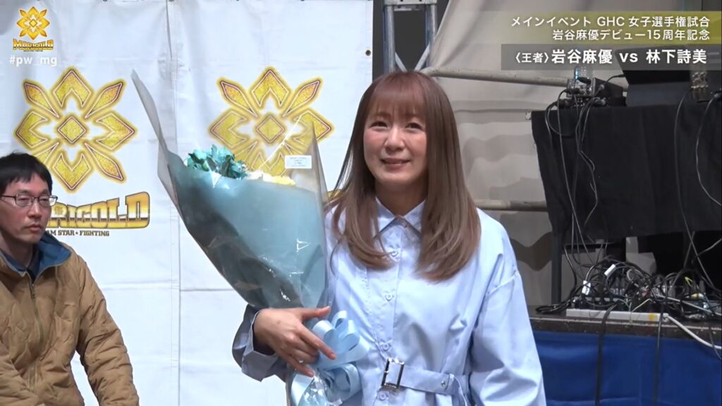 Before the match began, a ceremony was held to commemorate Iwatani’s 15th year in pro-wrestling.