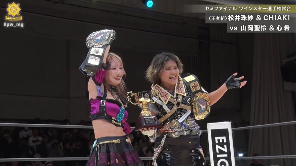 In other action, Misa Matsui & CHIAKI defended their Marigold Twin Star Championship against Seri Yamaoka & Shinno AKA SPUNKY MONSTER. It was the fourth defense of the tag titles by the Darkness Revolution duo and the emerged victorious once again. CHIAKI ended the match with a diving guillotine drop against Shinno to keep the Twin Star Titles within the Darkness Revolution faction.