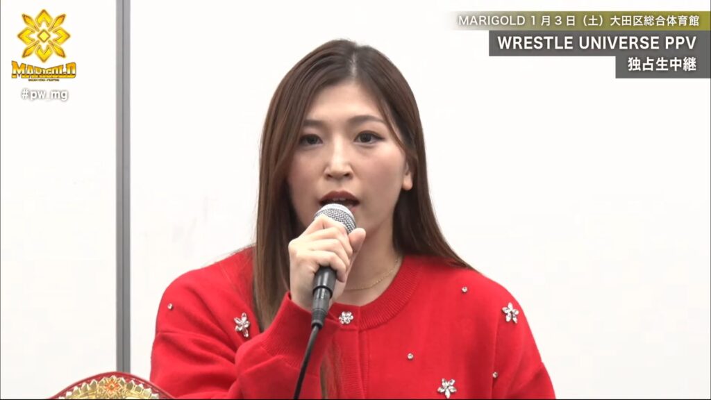 “Yes, well, first of all, I have the confidence that I won’t lose to anyone when it comes to my feelings for Marigold. It started four years ago when I first met Ogawa-san; he took me in when I was a nobody. Well, since that time, I have decided that I will absolutely become great and repay my debt to Ogawa-san, I’ve had that decided since that very day. That is why, when Ogawa-san said he was creating this new organization, Marigold, I decided to follow him without hesitation. I wanted to be of help to Ogawa-san, and I thought that in such a place, I would become a stronger and stronger wrestler. And, well, I wanted to become famous. And then, around the time I became a tag team champion, I was actually really struggling, thinking, ‘Is this already my limit?’ ‘Should I aim higher?’ ‘Should I aim for the singles belt?’ and so on. But then, during the year of Marigold’s inauguration… well, Giulia, Nanae Takahashi, Sareee, Utami Hayashishita, and Miku Aono. It is no exaggeration to say that I am who I am today because I fought those people in singles matches in the main event. The people whose names I just mentioned are all people who have held the Red Belt. What I believe a Red Belt champion should be, well, it’s not just about one’s own strength, but being able to bring out, to draw out the best in the opponent; I think that kind of thing is necessary, and I want to become that kind of wrestler. What is the decisive difference between Miku Aono and me? Miku Aono is a very, very good girl, a ‘goody-two-shoes,’ an elite. Yes, she has a very classic, respectable image. But for me to get this far, I crawled up, really crawled up from the bottom, crawled up, and crawled up to get here. That is why my feelings regarding this challenge are truly strong. To be honest, there is always pressure whenever I am allowed to stand in a main event. But I have experienced the main event many times over the past year, and I believe I am here today because I truly overcame that pressure. Because I am that person, I want to prove that if you stay true to your beliefs without bending them, your dreams will definitely come true. And if I become the Red Belt champion, I want to make Marigold a dazzling and exciting place. First of all, Miku Aono was my opponent in my debut match, and last year, or was it this year? This year, and next year, we have the same match in the same venue. Also, we are the same age; we were born in the Year of the Horse, right? Since next year is our zodiac year, I want to have a hot battle in the main event. And I have just one thing I want to ask Miku Aono. You said you would show us a ‘new Miku Aono’ before taking the Red Belt, but I still don’t know what that new Miku Aono is like, so I’m looking forward to seeing that too.”