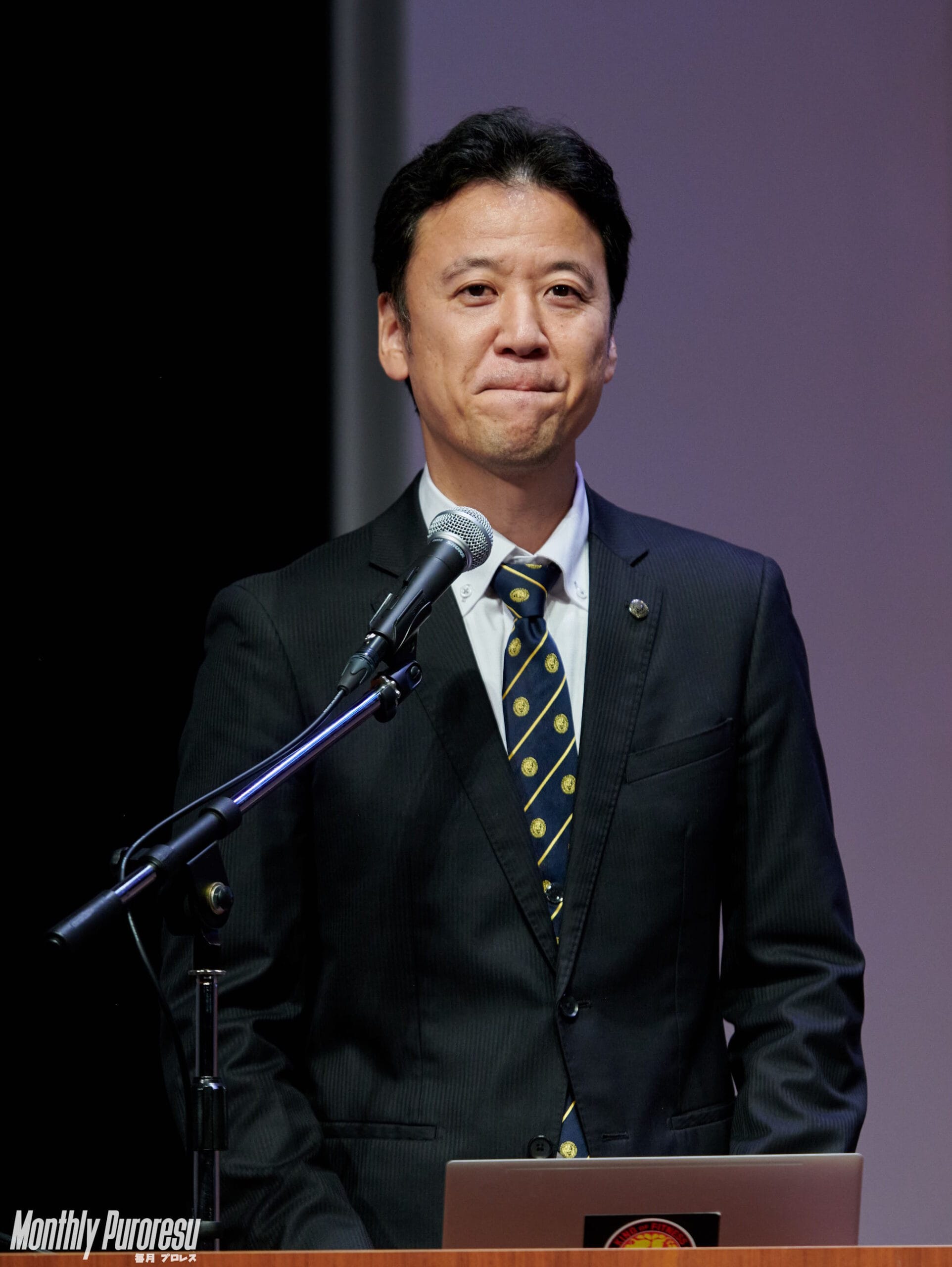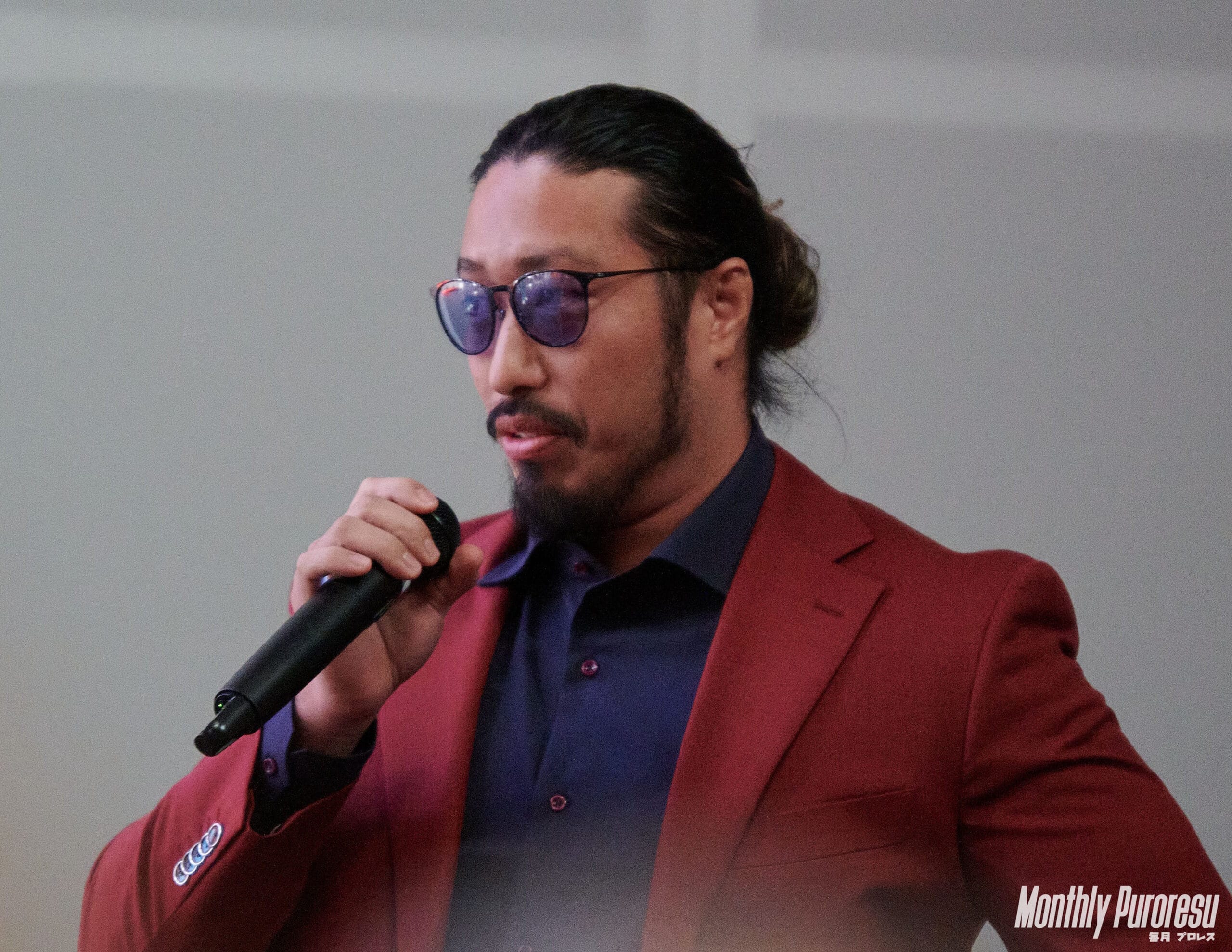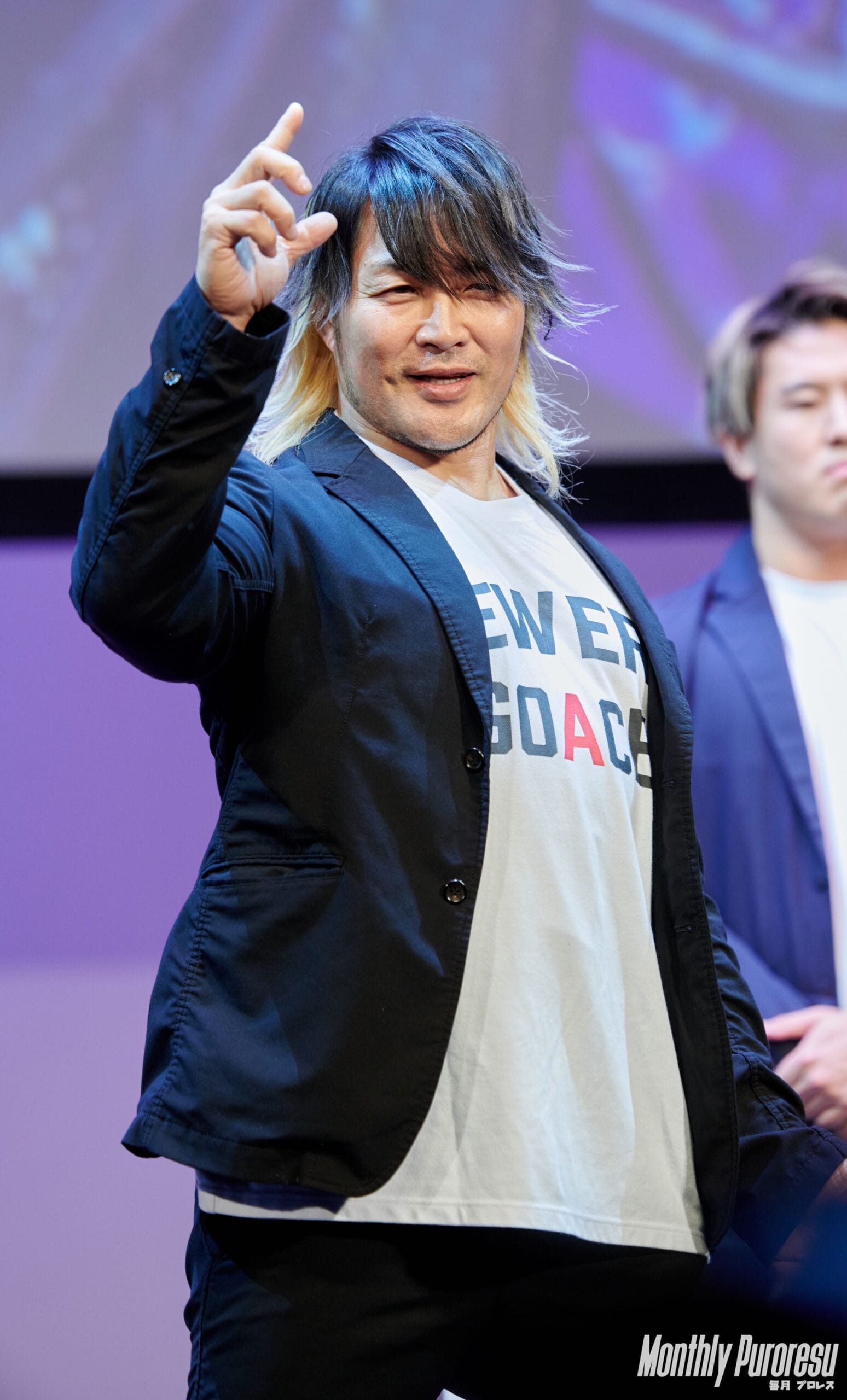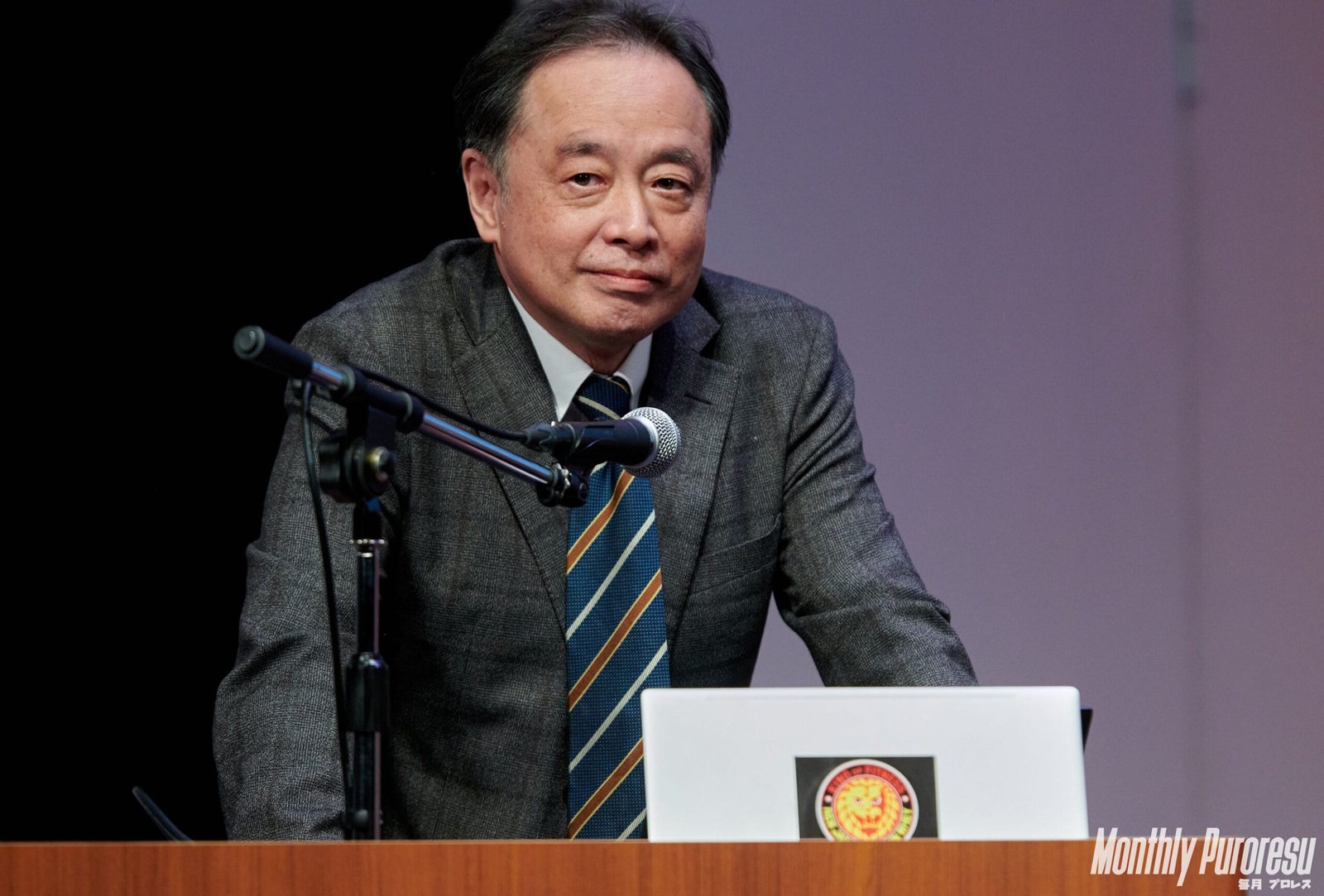 NJPW President Takami Ohbari and Takaaki Kidani come on stage. They are joined by Hiroshi Tanahashi, Shota Umino, and Master Wato.