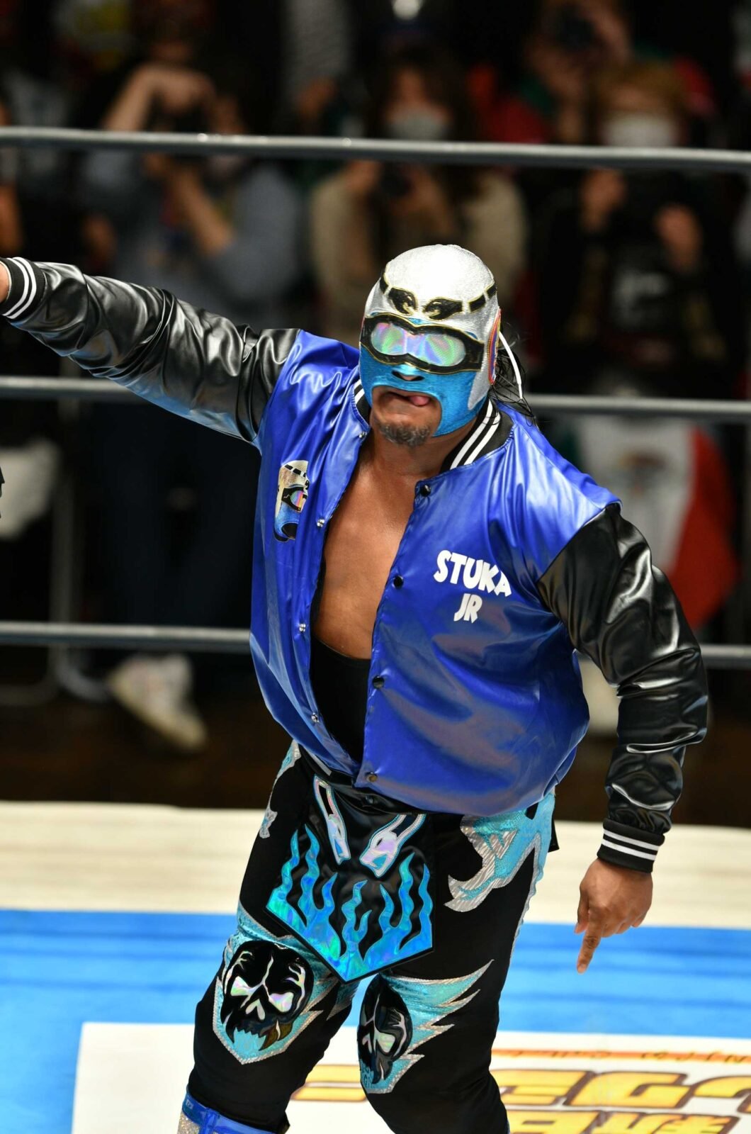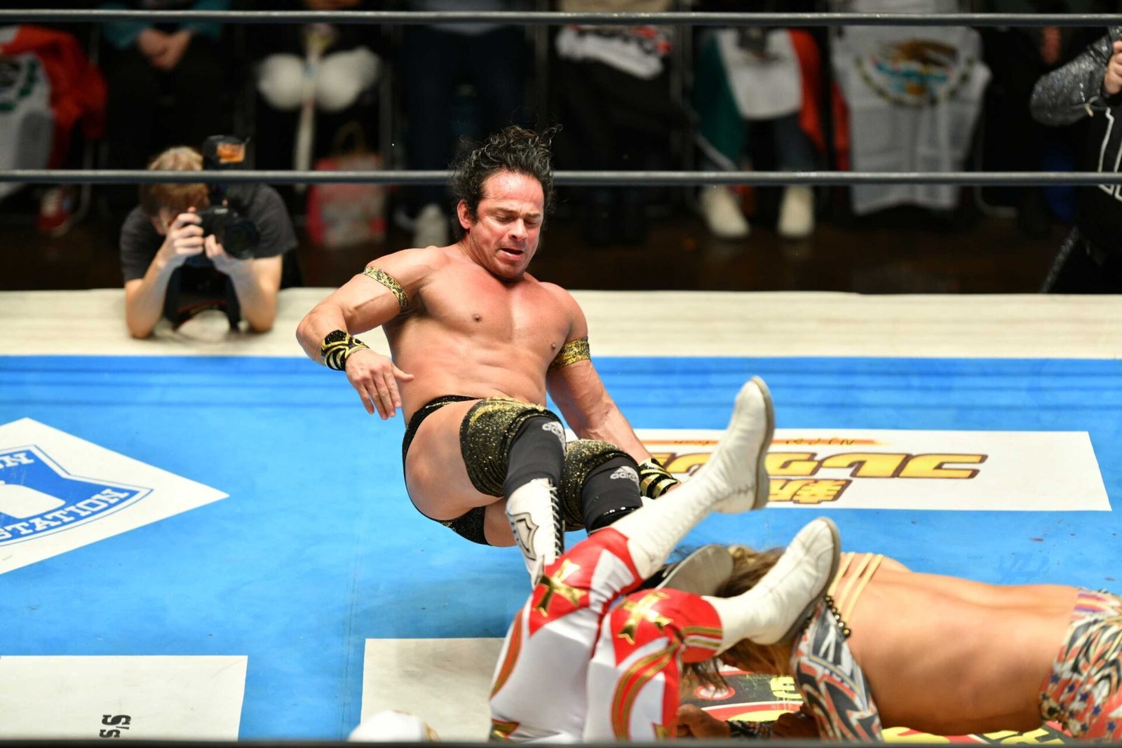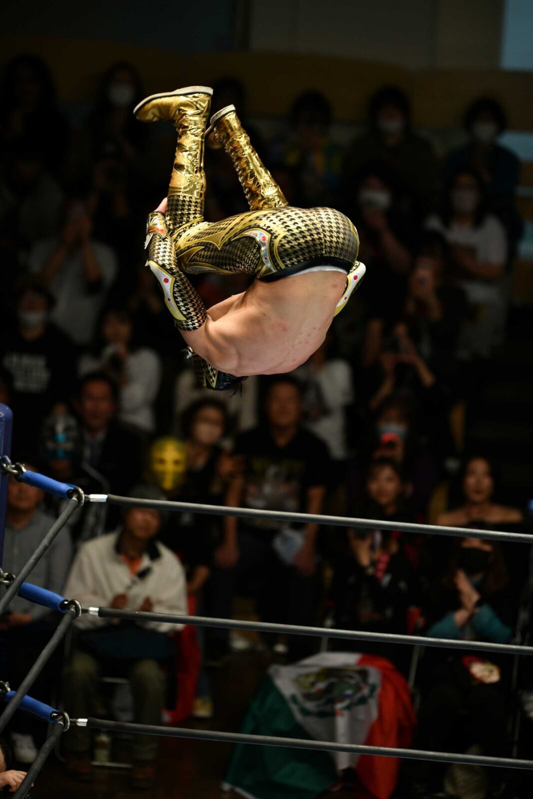As Mexican flags waved in the crowd and green & red glows sticks clanked together, Mascara Dorado Jr. addressed the crowd during a curtain call with CMLL and NJPW stars soaking in the electric atmosphere.