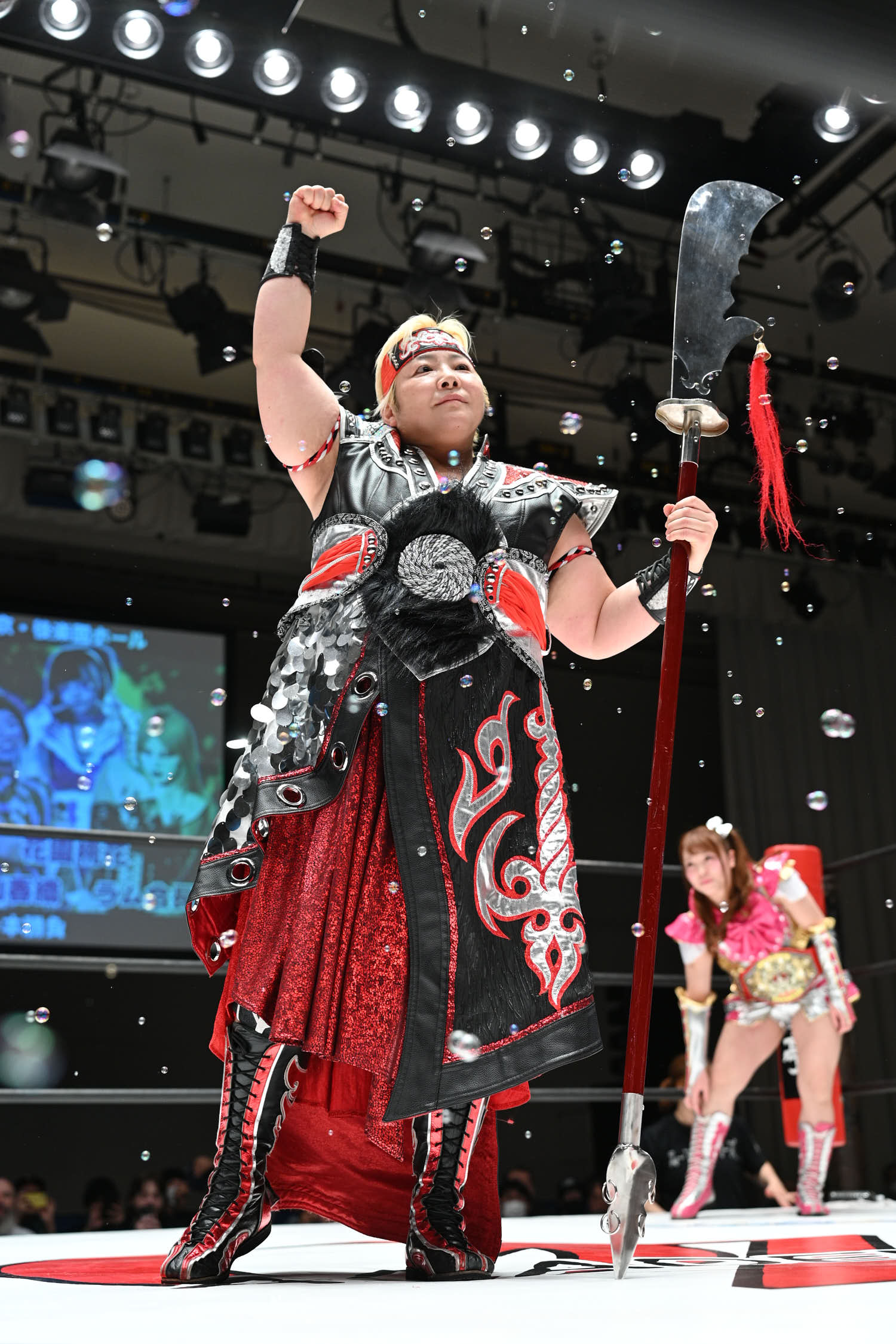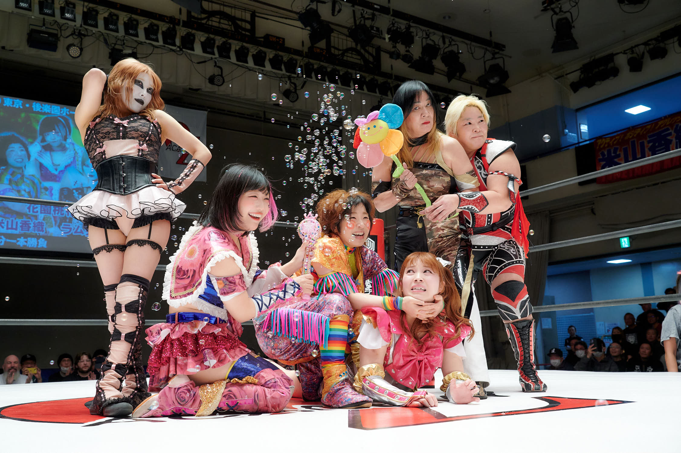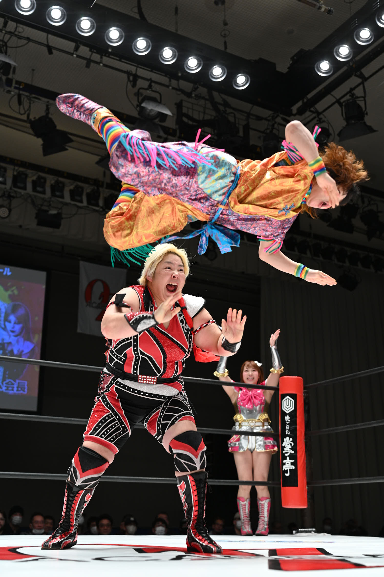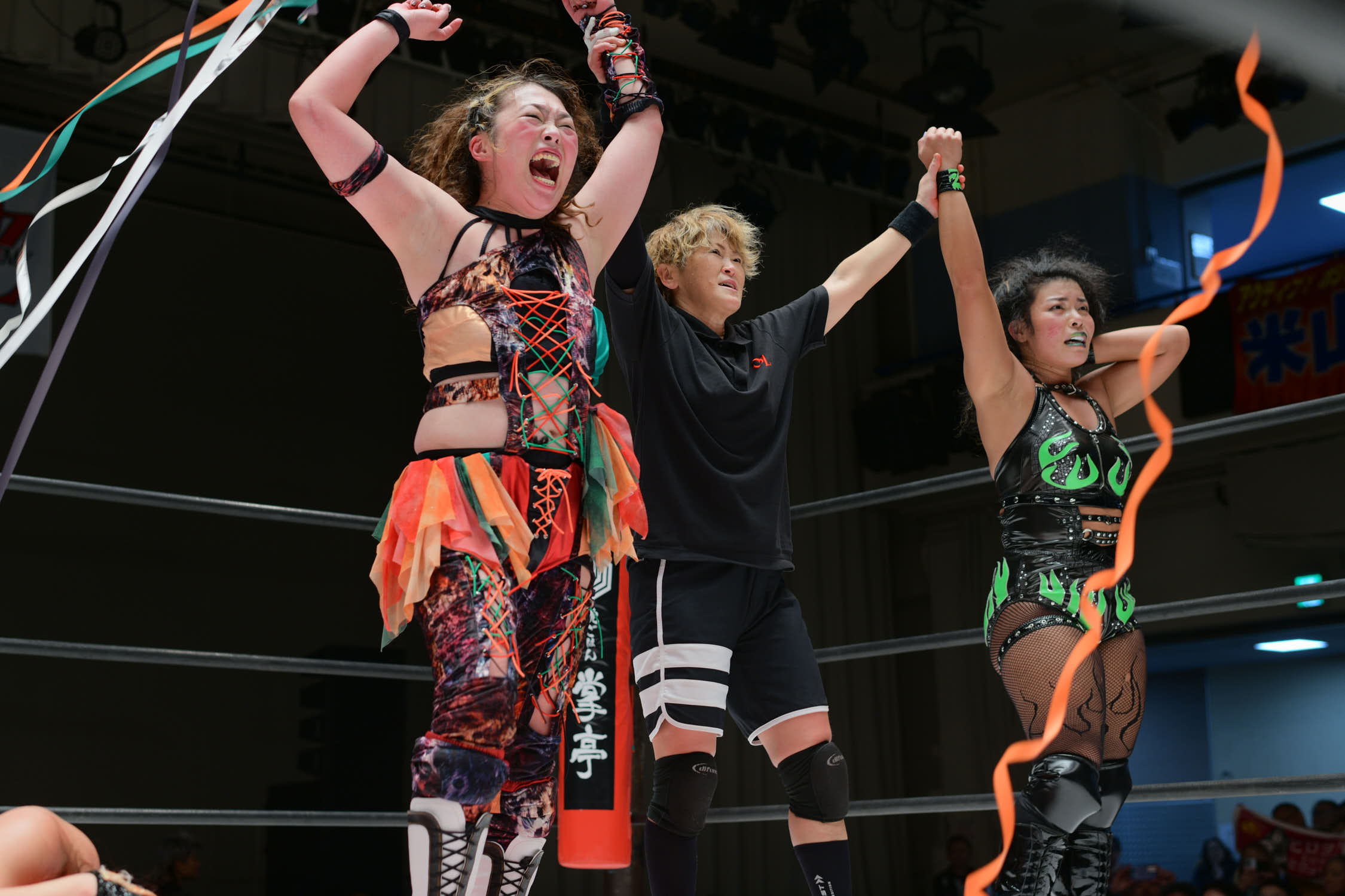 In the main event, Hiroyo Matsumoto and Zones defeated Red Energy (Miyuki Takase and Mika Iwata). Very dynamic match where Zones especially showed how much she has grown in the last year. Matsumoto pinned Takase to secure the victory and retain the gold. After the match, different teams came out ot the ring and asked for a shot at the belts. Matsumoto accepted but to decide the challenger they will fight as units before.