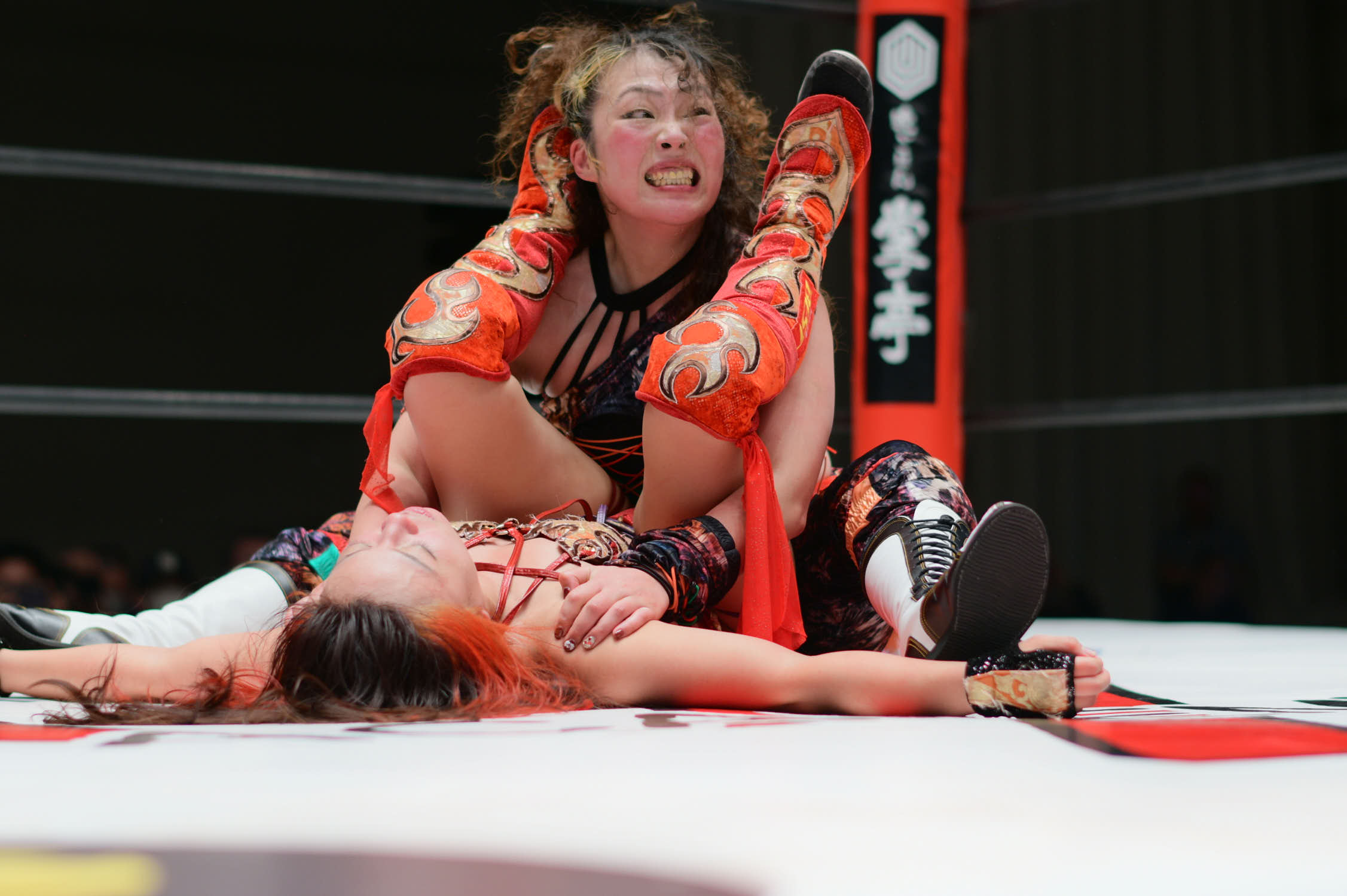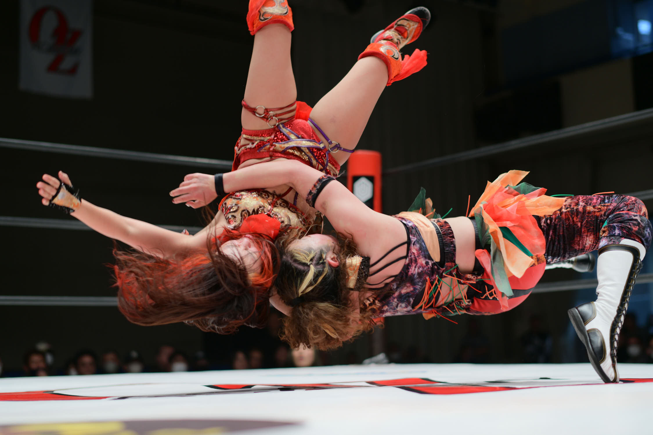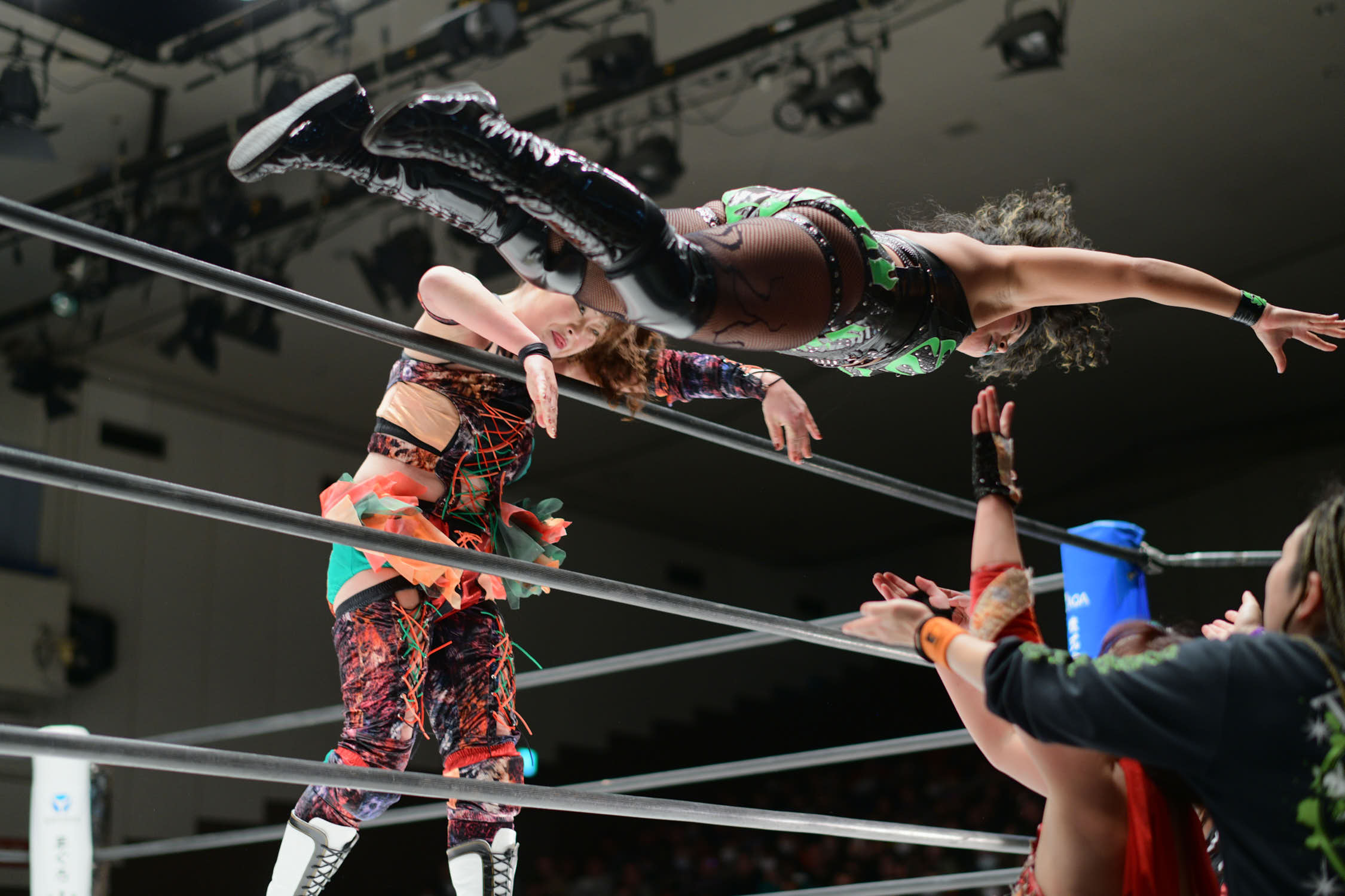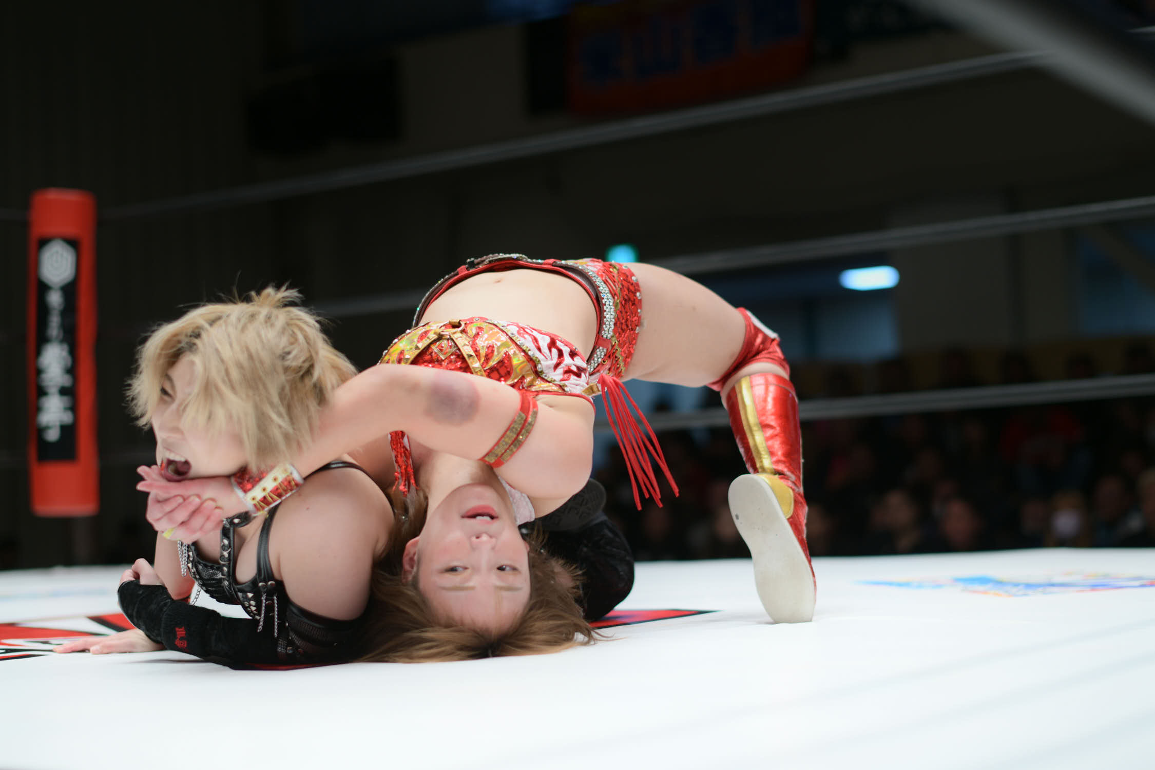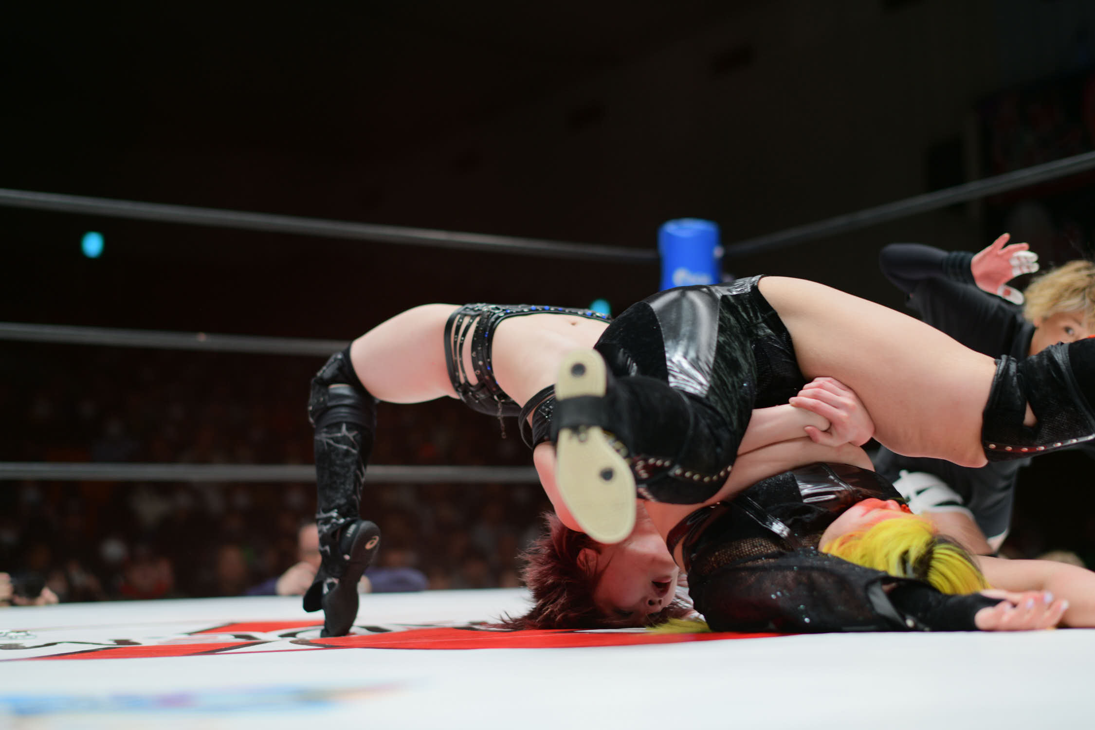 In the main event, Hiroyo Matsumoto and Zones defeated Red Energy (Miyuki Takase and Mika Iwata). Very dynamic match where Zones especially showed how much she has grown in the last year. Matsumoto pinned Takase to secure the victory and retain the gold. After the match, different teams came out ot the ring and asked for a shot at the belts. Matsumoto accepted but to decide the challenger they will fight as units before.