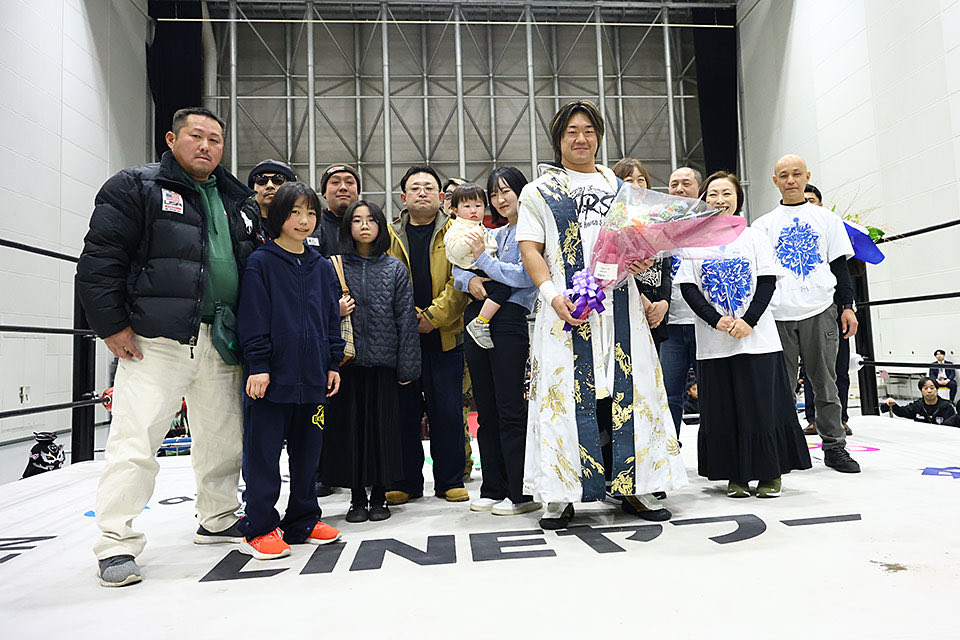 Endo celebrated in the ring following his successful return to his hometown of Shiroishi, Miyagi.