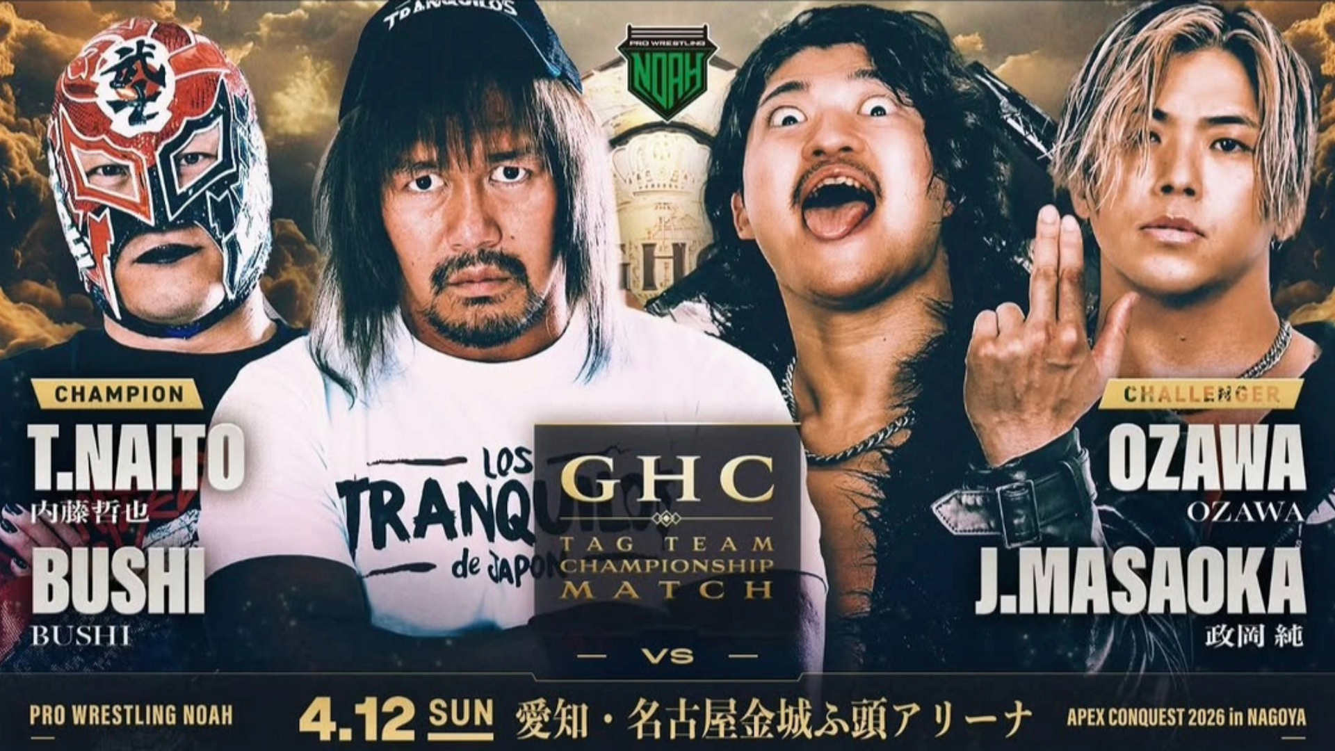 GHC Tag Team Champions, Tetsuya Naito and BUSHI, are set to defend their titles against TEAM 2000X’s OZAWA and Jun Masaoka on April 12th at Pro Wrestling NOAH’s APEX CONQUEST 2026 in NAGOYA.
