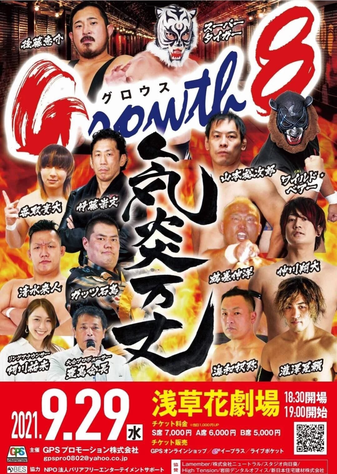 The independent wrestling group, along with the sub-promotion HERO that ACT and even Kaguya have been associated with, has utilized Agawa’s talent not just for ring announcing but for posters as well. HERO is a wrestling company that caters to fans with disabilities like blindness and deafness. GPS’s “気炎万丈” is read as kien-banjo. The meaning is “to be excited enough to overwhelm others”.