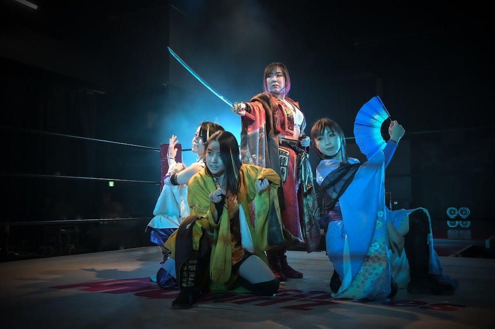 In addition to ring announcing for AWG, Yumi Agawa is also an in-ring performer in the sister promotion Action Ring Girl’Z (ARG) for the faction Kaguya. ARG is a musical fantasy production that includes matches in a non-traditional wrestling atmosphere. She portrays the character Kikyo (controlling the wind with her fan), acting in a sisterly or motherly role, while ACT plays Hisen, Naho Yamada plays Hinata, and Rensan plays Hakuju. Kaguya is a group of samurai on a mission to restore their war-ravaged village. While they can manipulate time, they are on a quest for three sacred treasures to achieve this goal. Kaguya is shrouded in mystery, with its story developing across productions. Their ARG characters exist separately from their AWG counterparts.